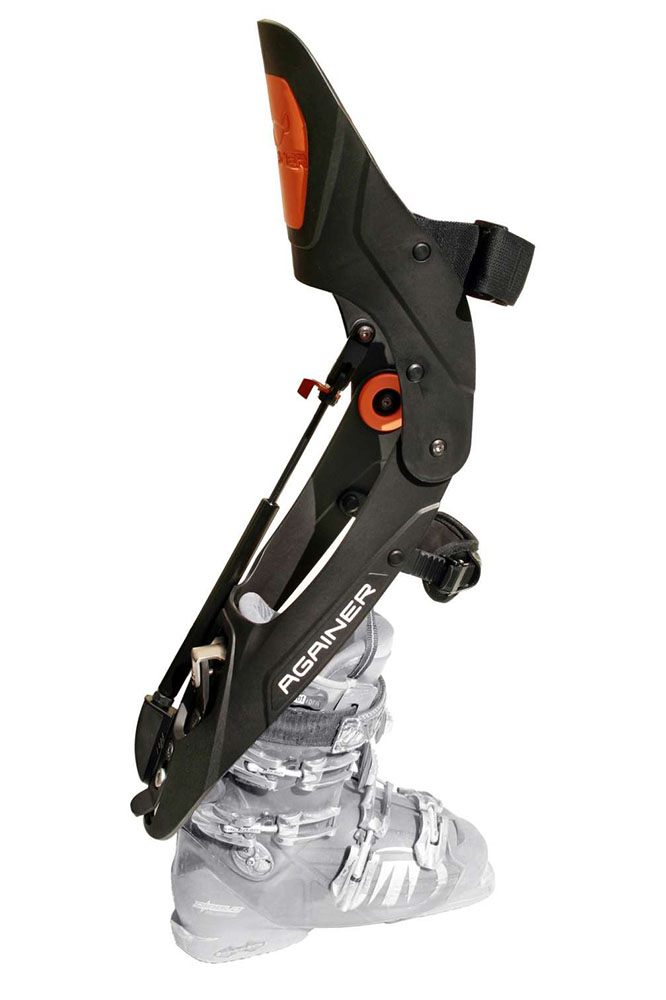 Againer se jednoduše připne k lyžařské botě za pomocí zámkového mechanizmu.