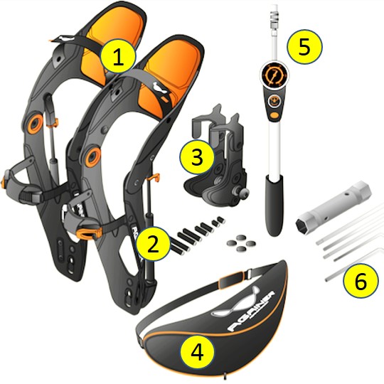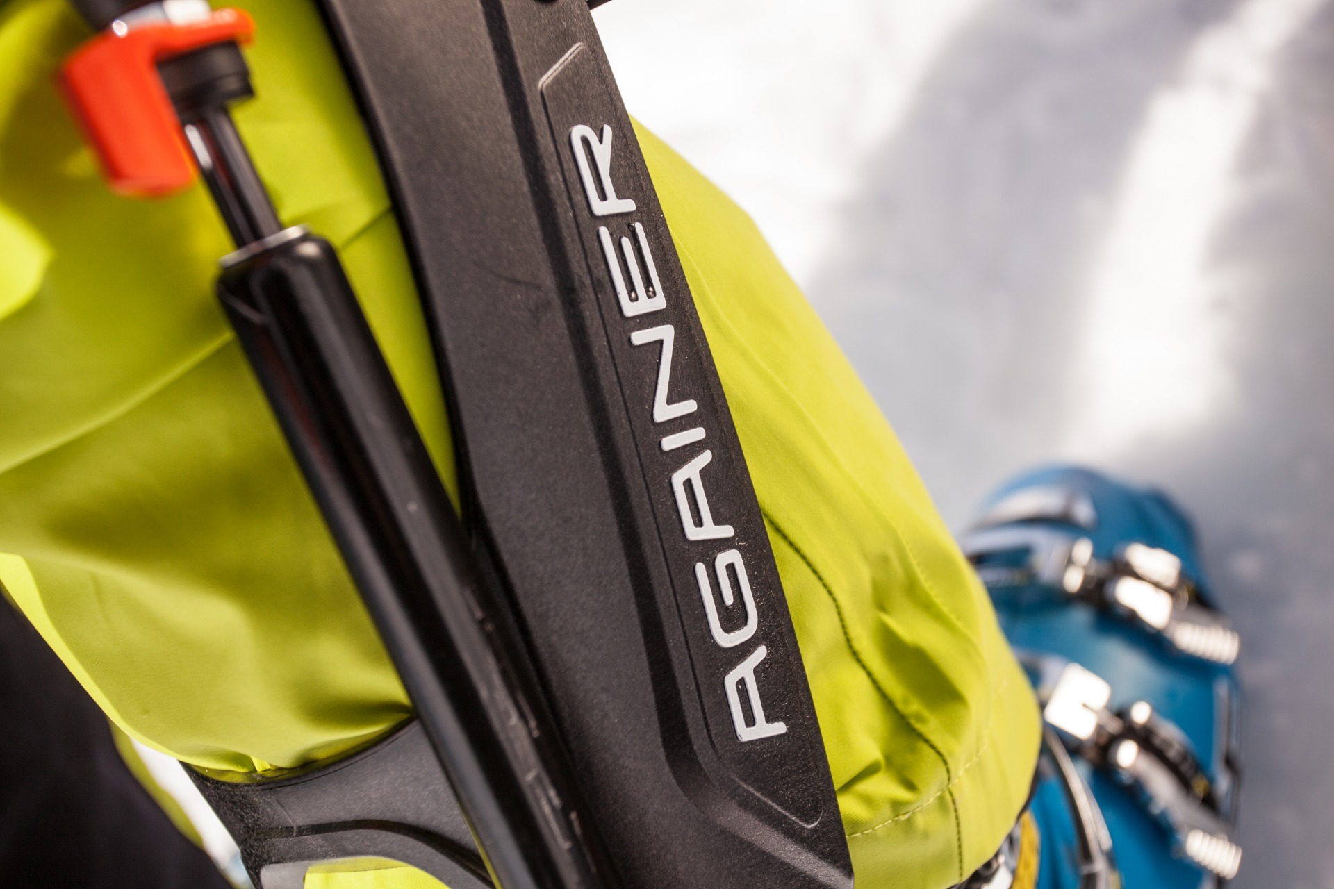Againer se upíná dvěma pásy (stehno a holeň) zvenku na obě nohy. Zacvakávacím zámkem se fixuje k lyžařské botě.